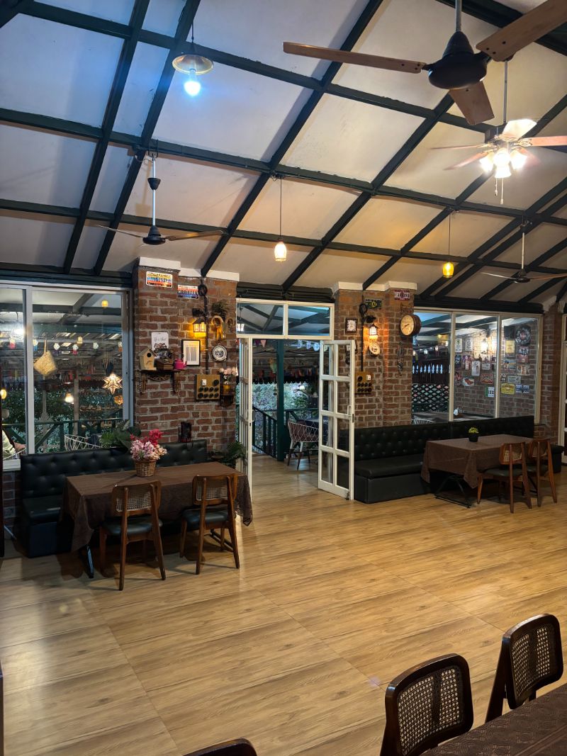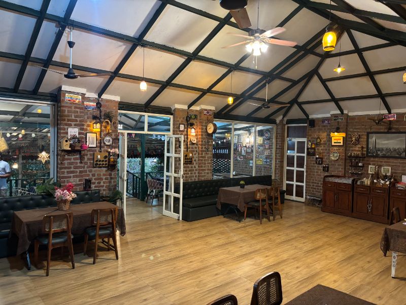 High ceilings, exposed brick walls, and industrial lighting create a grand ambience. Enjoy multi-cuisine delights prepared with fresh ingredients.