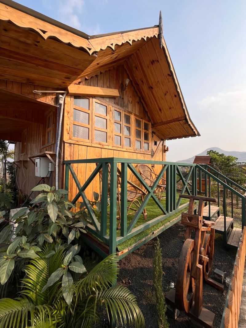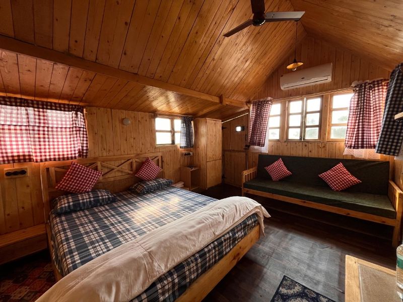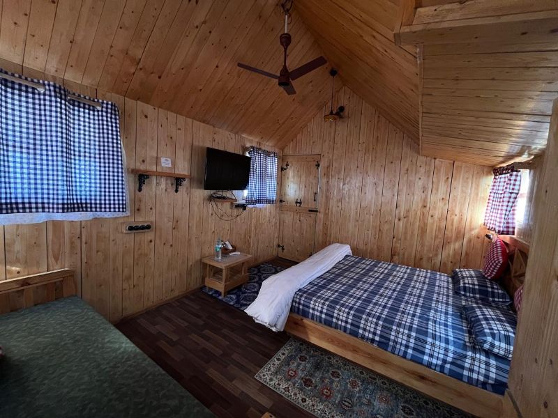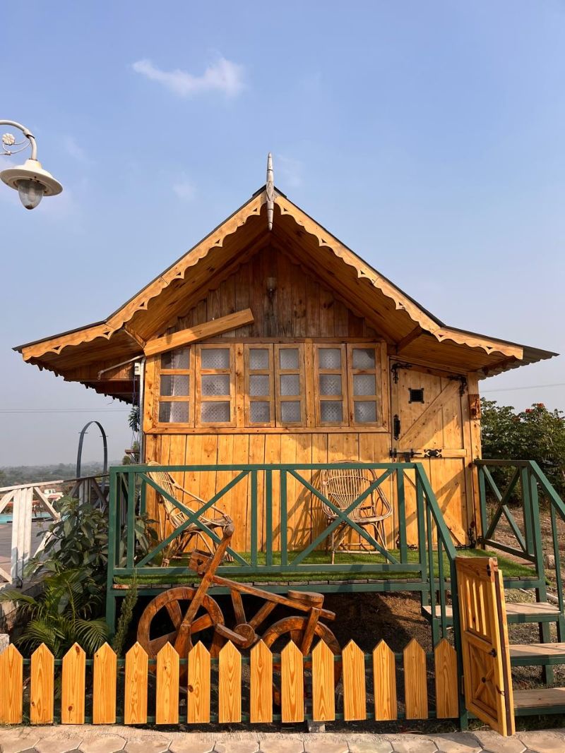 A unique Alpine-style wooden cabin. It features warm timber interiors, a cozy front deck, and a distinct rustic charm. Perfect for couples.